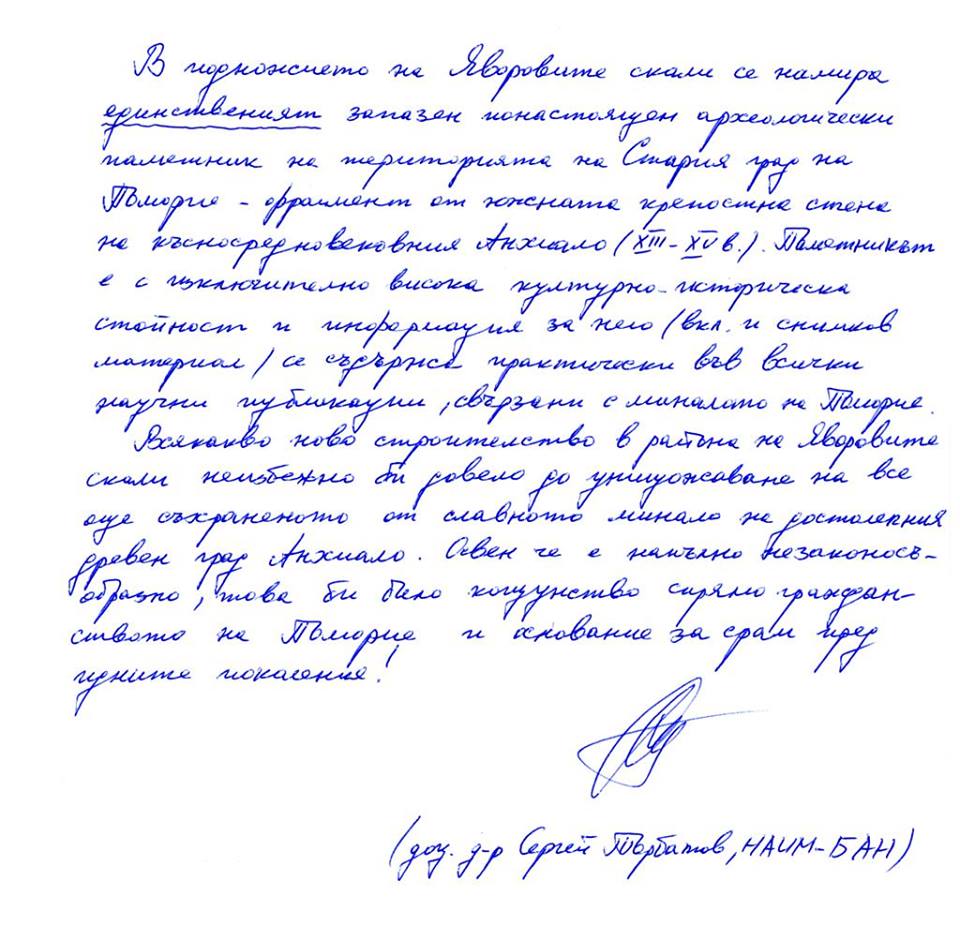 Категорична позиция срещу застрояването на Яворовите скали пред Биволъ изрази Доц. д-р Сергей Торбатов. Д-р Сергей Торбатов е старши научен сътрудник, секция антична археология към Националния археологически институт и музей /НАИМ/ – БАН, доктор по история, специалист по археология. Той ръководи археологическите разкопки в Поморие и обследва при откриването и разкриването на археологически обекти след започването на изкопно-строителни дейности. Авторитетният учен определи предстоящото бетониране на Яворовите скали категорично като „незаконосъобразно“, „кощунство“ и „срам за идните поколения”.