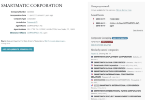 Компанията е регистрирана не само в САЩ: SMARTMATIC INTERNATIONAL CORPORATION DELAWARE (Делауър, 2005), Smartmatic USA Corporation (Колорадо, 2018). Старата централа на SMARTMATIC CORPORATION (Флорида, 2000) е пренесена в Лондон.