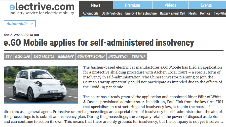 В началото на юли 2020 г. окръжният съд в Аахен (Германия) открива производство по несъстоятелност. Но в края на август 2020 г. компанията обяви, че малкият производител на електрически автомобили е намерил стратегически инвеститор: нидерландският финансов инвеститор ND Industrial Investments B.V става мажоритарен акционер в e.Go Mobile.