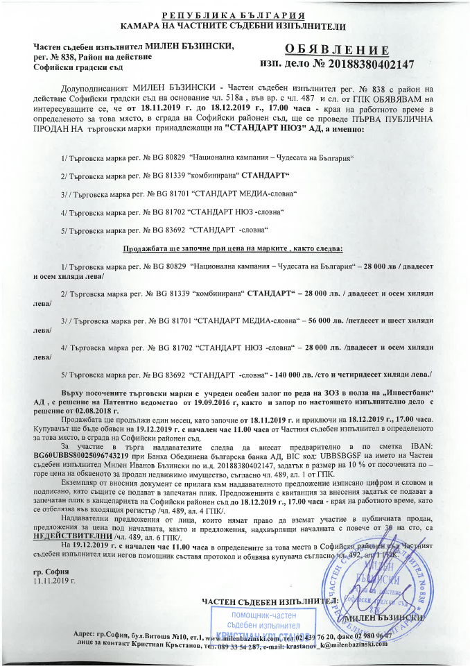 Столичният съдебен изпълнител Милен Бъзински насрочи публична продан за всички търговски наименования на вестник „Стандарт нюз“. Тя ще се проведе до края на работния ден на 18 декември т.г. в Софийския районен съд. Информацията за това е публикувана на личната му интернет страница /виж тук/. От обявата става ясно, че се продават търговската марка на вестника, всички вариации с нея и други наименования, които изданието някога също е регистрирало. Сред тях е и името „Чудесата на България“, под което медията организираше, заедно с богатите общини в страната, различни форуми. Купувачът ще бъде обявен на 19 декември в 11:00 часа.