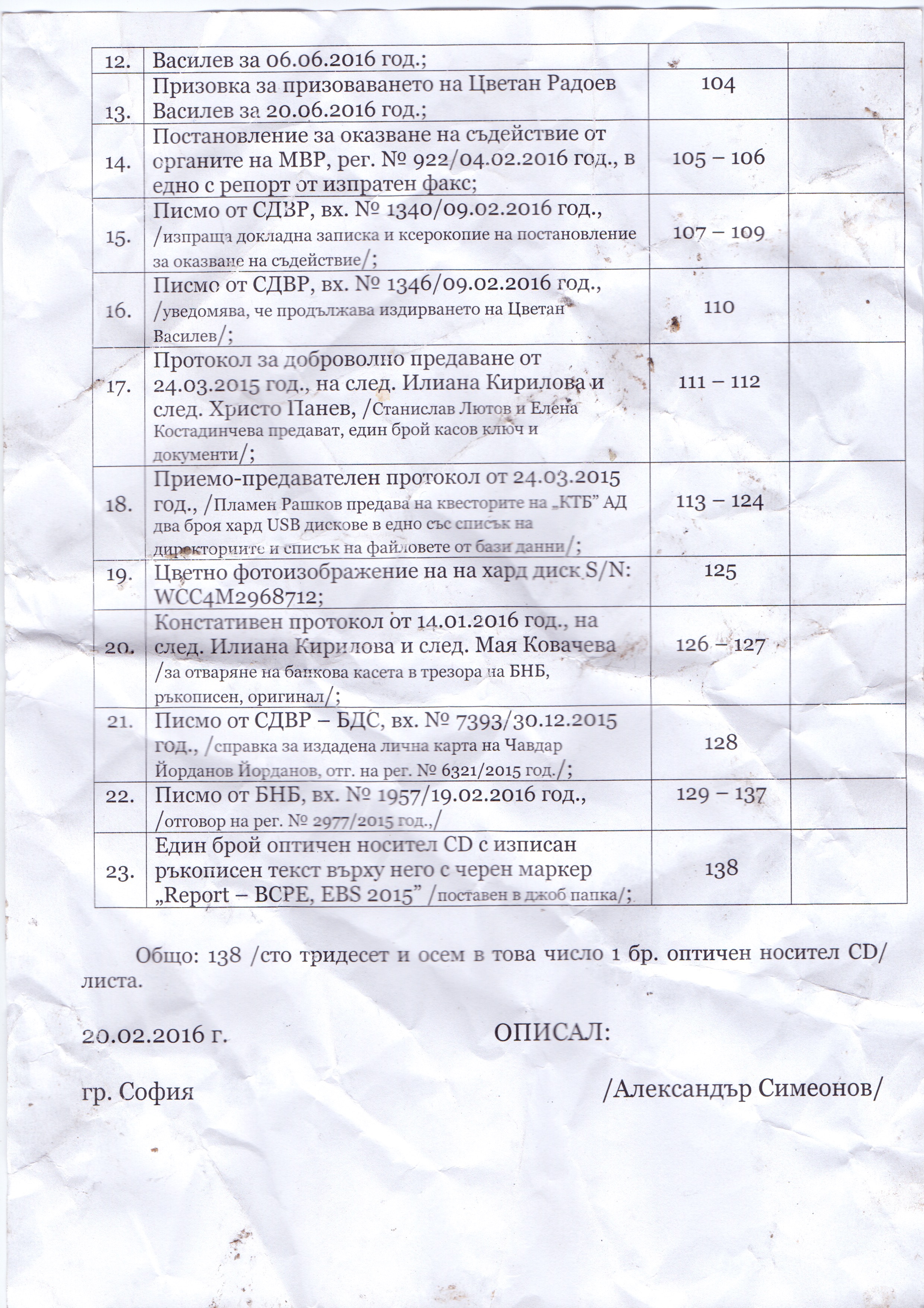 Сред тях има такива, които не могат да бъдат извадени от Търговския регистър и представляват следствена тайна. Такива са например запитванията за информация до МВР и Митниците за пресичането на границата от лица с българско и чуждо гражданство. От документите се разбира, че се извършват процесуални действия по искане за правно съдействие постъпило от чужда “кралска прокуратура” (вероятно испанската), които са относно сирийски граждани посещавали България. Има и опис на документи по делото КТБ, направен на 20.02. От него става ясно, че Цветан Василев ще бъде призован на 20.06.2016 г.