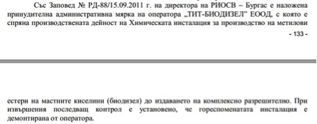 Изключително противоречива и отново с комплексно нарушение е и фирма „ТИТ БИОДИЗЕЛ“ ЕООД, която през годините като мениджъри и собственици са си прехвърляли баща и син – Теньо Тенев и Иван Тенев, а впоследствие със заповед на компетентен орган е забранена дейността й. В Регионален доклад на МОСВ от 2012 година за състоянието на околната среда през 2011 и нейните замърсители се посочва, че фирма „ТИТ БИОДИЗЕЛ“ ЕООД, в нарушение на закона, произвежда биодизел без да притежава разрешение за това.