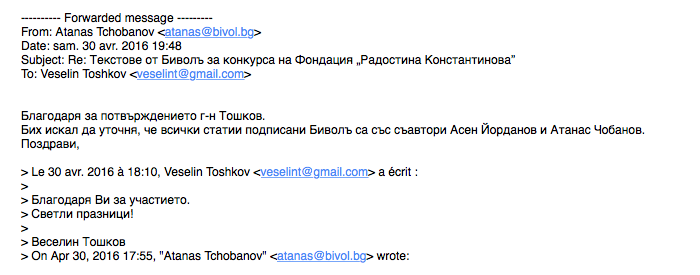 Веднага след потвърждението, че мейлът е получен Чобанов изпраща и пояснението, че зад приложените разследвания стоят Асен Йорданов и Атанас Чобанов. Пояснението е прието безспорно от Веселин Тошков!