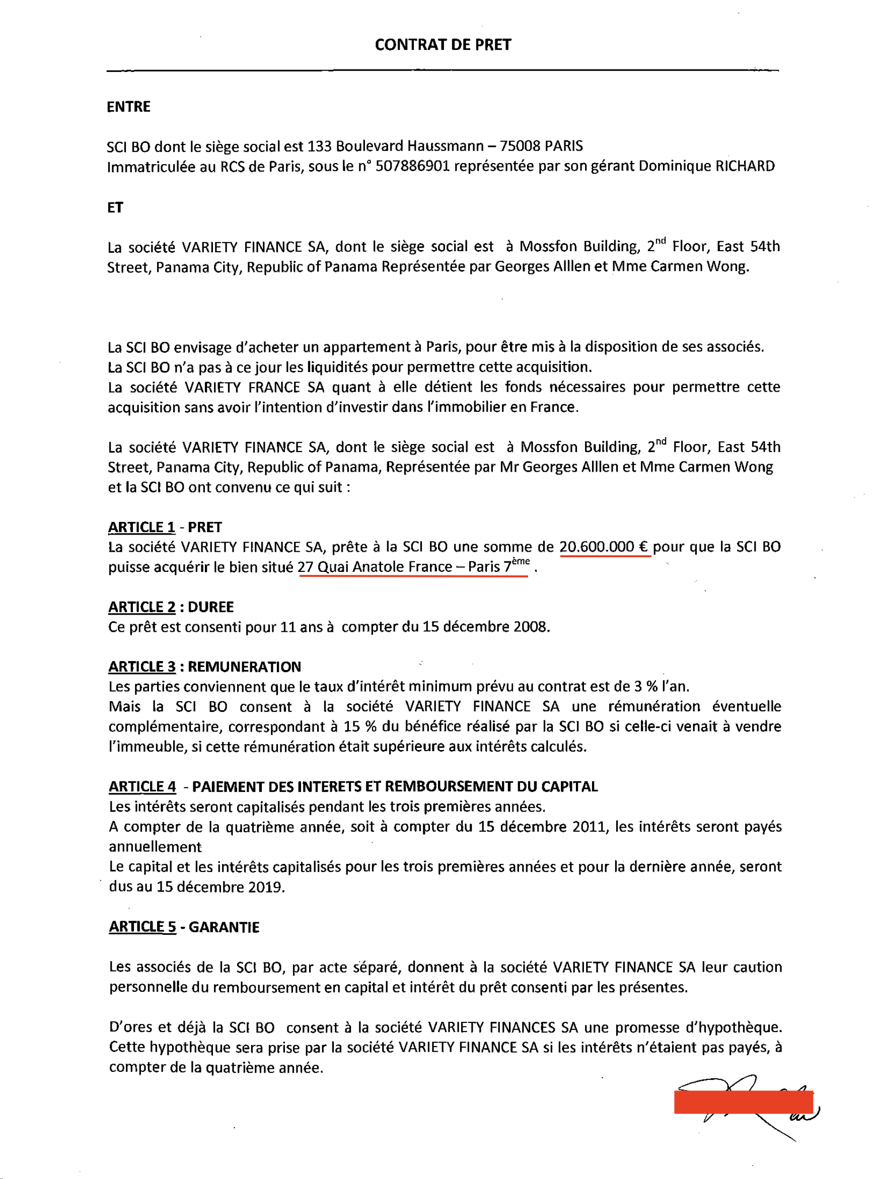 SCI BO е регистрирана на 3 септември 2008 г. първоначално на адрес 133 boulevard Haussmann. На същия адрес месец по-късно е регистрирана и SCI BOTWO. Впоследствие SCI BO се мести в сградата на 27 quai Anatole France.