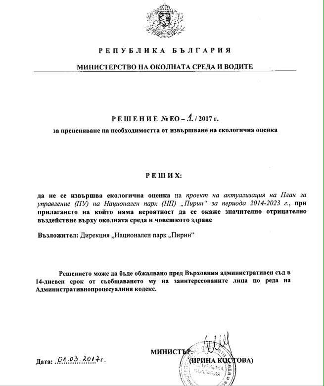 На 1 март Костова се разпореди, че няма нужда от екологична оценка за проекта за нов план за управление на националния парк.