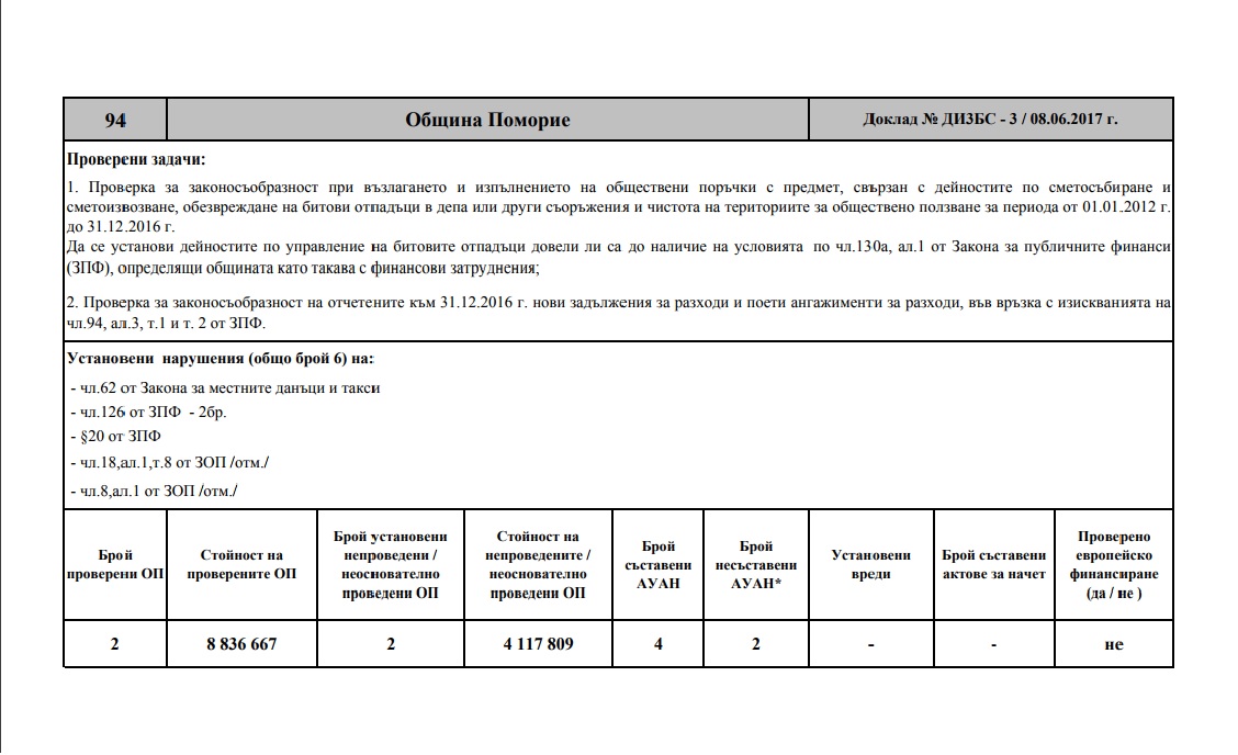 При проверка на АДФИ на одобрените по план и на фактически отчетените приходи и разходи за дейност „Чистота“ за периода 01.01.2012 г. до 31.12.2016 г. е констатирано, че през 2013 г. Община Поморие е изразходила 20 933,62 лева за плащания, които не са свързани с дейност „Чистота“, което е в нарушение на чл.62 от Закона за местните данъци и такси /ЗМДТ/; през 2014 г. Общината е изразходила 67 999,08 лева, а през 2015 г. – 104 225,71 лева за плащания, които не са свързани с дейност „Чистота“, в нарушение на чл. 126 от Закона за публичните финанси /ЗПФ/. Пари от едно перо се прехвърлят незаконосъобразно към друго.