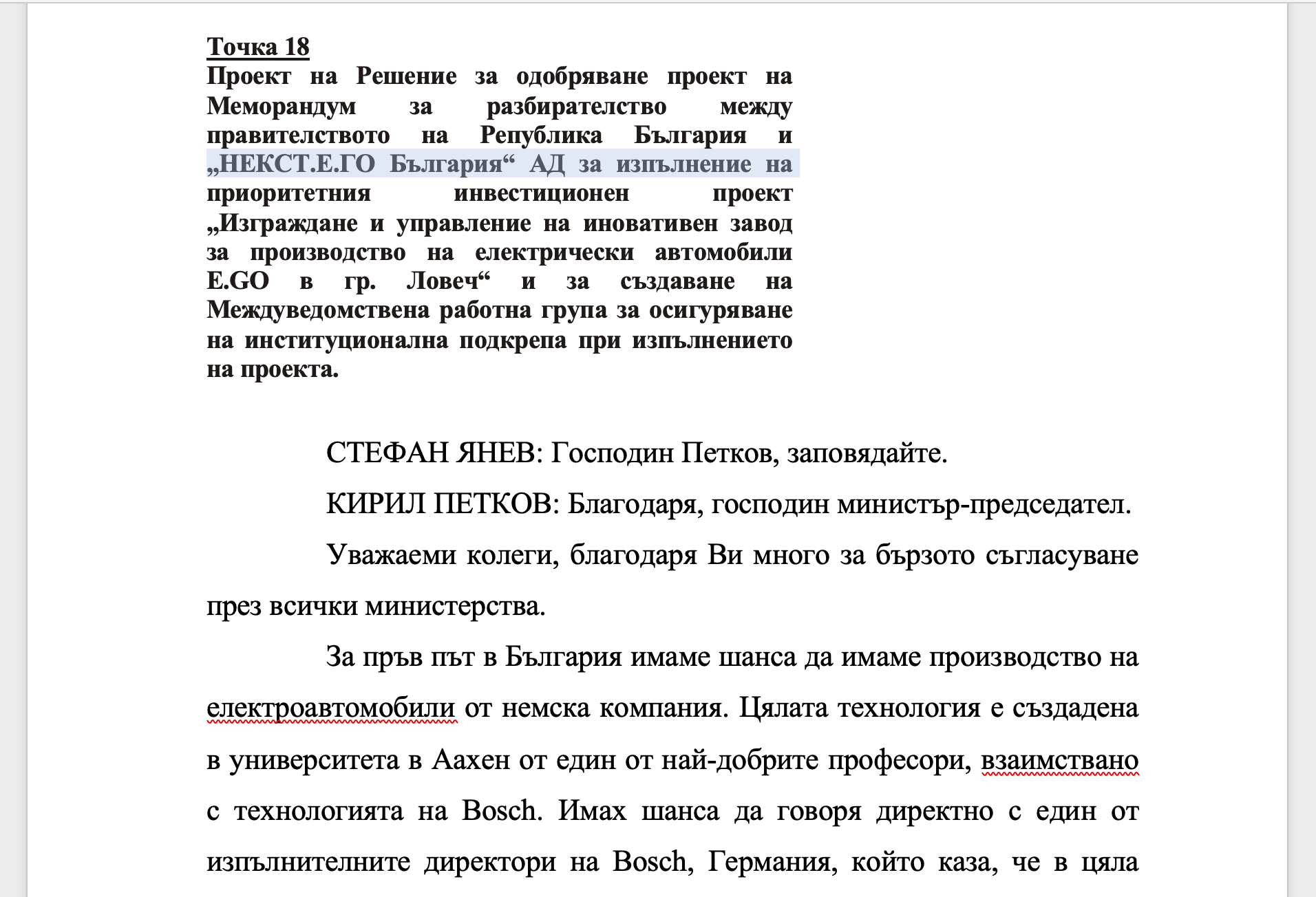 От получените до момента предхождащи Меморандума документи, се разбират някои неизвестни досега факти. Единият от тях е, че стенограмата от заседание на Министерски съвет от 14 юли 2021 г. показва, че пакети от сериозни забележки, поправки, уточнения са имали бившите служебни министри на правосъдието Янаки Стоилов и на финансите Асен Василев спрямо меморандума с инвеститора, съставен от Кирил Петков. Спорните финансови и правни условия потвърждават изнесената от „Биволъ“ информация за “инвеститорите” във фабриката за електромобили. Досега не е ясно какъв е финалният договор с българо-германската компания “Некст. е. ГО България”, зад която стои нидерландският инвестиционен фонд, придобит от най-богатите албанци.