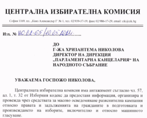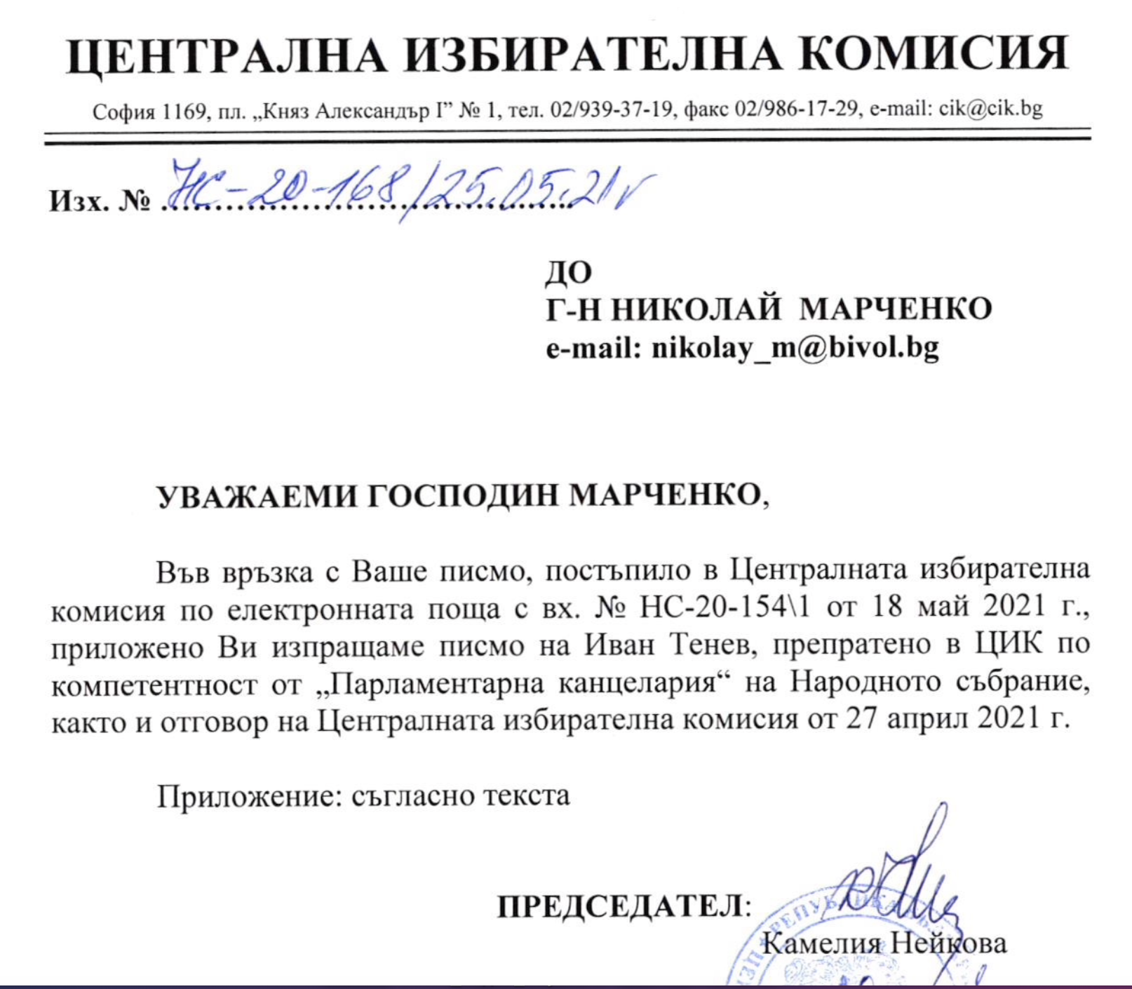 Сигналът му е приет от Директора Дирекция „Парламентарна канцелария“ към Народното събрание Хризантема Николова, която го препраща по компетентност до ЦИК (виж долу).