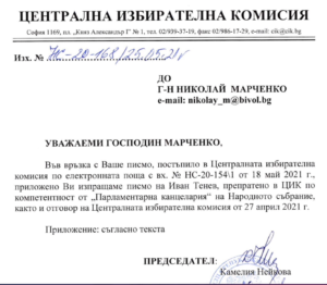 „Както и писмото, което съм подготвила до господин М. от сайта „Биволъ”, с който Ви предлагам да изпратим приложени този сигнал на И. Т., както и отговора, изготвен и приет от Централната избирателна комисия на 27 април 2021 г. (Време за запознаване.)“