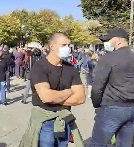 „Муцуните ги били викнали по искане на СЕК – да пазят мероприятието от провокации на “Възраждане”. Тази “гражданка” на една от снимките е Звезделина Каравелова – кандидат за нар. представител от „Възраждане“ и виден антиваксър“, анализира още Ошавков.