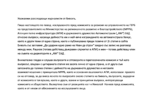 “Пиша настоящото по повод изслушването пред комисията за ревизия на управлението на ГЕРБ на представителите на Министерство на регионалното развитие и благоустройството (МРРБ), Агенция пътна инфраструктура (АПИ) и държавното дружество Автомагистрали („АМ“) ЕАД относно въпроси, касаещи дейността им и най-вече изграждането на автомагистрала Хемус, както и други теми от една страна, както и публикувана преди повече от 2 г. статия в сайта Биволъ със заглавие „Да ударим едно рамо на Иван да строи“ заедно със запис на разговор между инж. Рашков (тогава действащ дъжравен служител в АПИ) и мен – тогава действащ член на съвета на директорите в „АМ“ ЕАД”, гласи писмото специално до сайта за разследваща журналистика Десислава Христова.