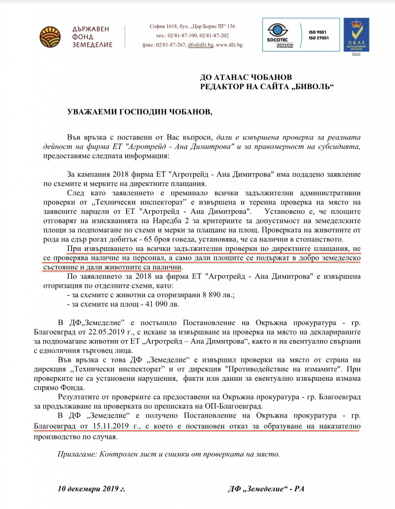 От Фонда са извършили такава проверка през 2018 г. и не са открили нередности. Като доказателство оттам изпратиха снимки на говедата и пасищата, както и контролен лист от проверката извършена през октомври 2018 г.