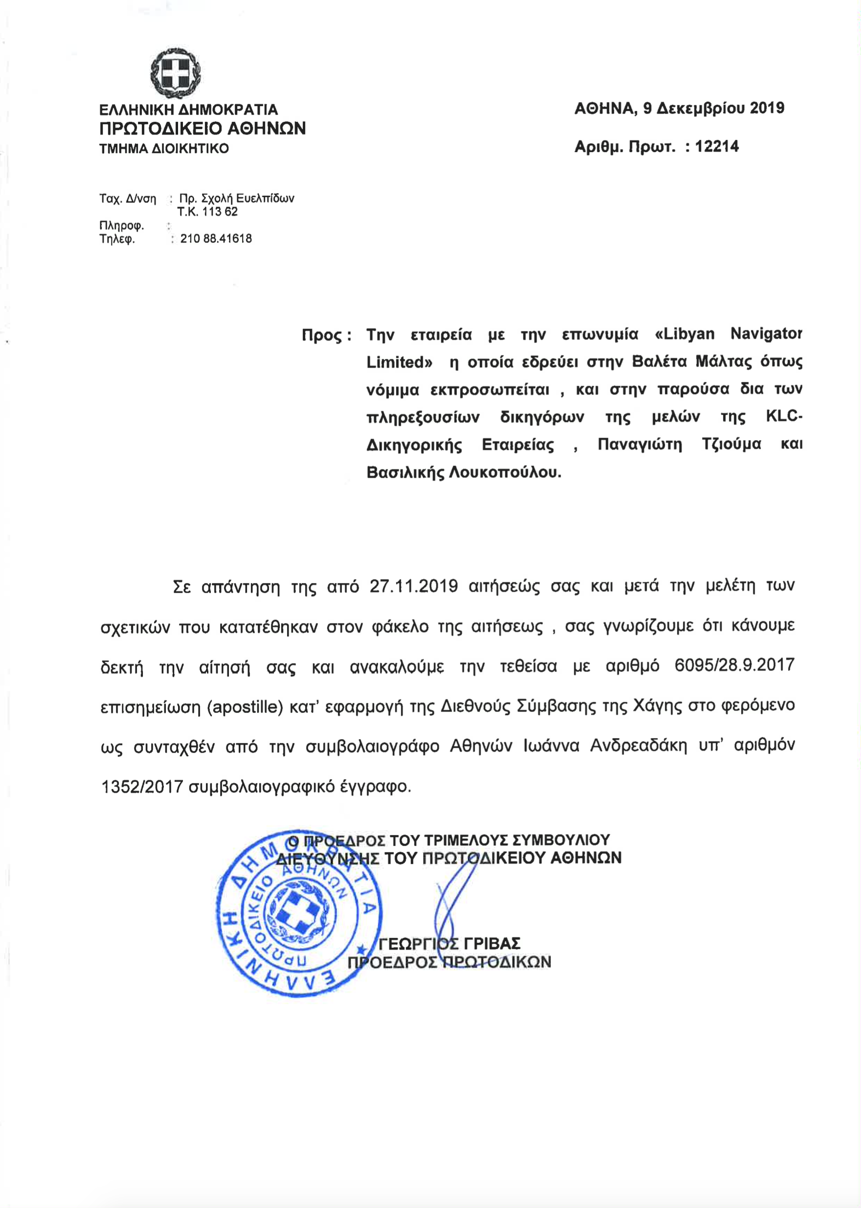 На 24.08.2017 г. Георгиос Лапас се явява при нотариус Андреадаки като се представя за посредник между “Булгаргеомин” и либийската компания “Либиан Навигейтър”, които според него искали да подпишат договор за морска ипотека. Тя подготвила документите и предала черновите на Георгиос Лапас, за да ги покаже на пълномощниците на “Булгаргеомин” и либийската страна. На една от срещите той дошъл с представителя на “Булгаргеомин” Асен Кавдански.
