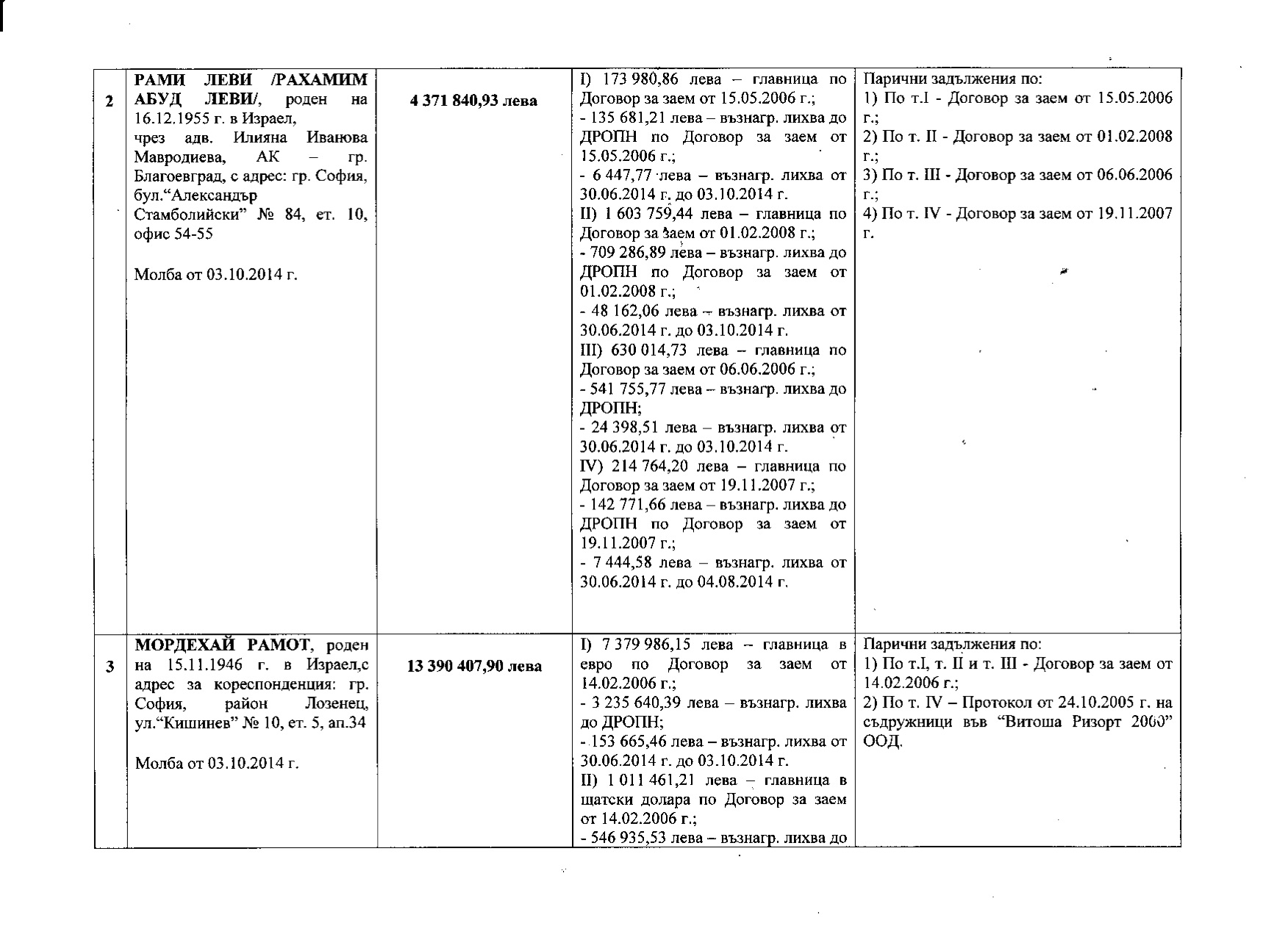 Борисов твърди, че се страхувал “Витоша Ризорт” да не прехвърли всичко на инвестиционния субект на инвеститорите “Рами Инвестмънт”. Иван Борисов признава, че “Витоша Ризорт” дължи целите си разходи на “Рами Инвестмънт” и това е факт. Борисов смята, че има реална опасност да бъде източена “Витоша Ризорт” и той нямало вече от кого да си потърси претендираните суми. Според него цялата работа е преминала в условията на тежки разправии с партньорите по осъществяването на проекта. Въпреки това обаче работата вървяла до момента на последния протокол, когато с помощта на адвокати решил да заведе дело за несъстоятелност, вместо търговски иск, защото му излизало най-евтино. Не можел да намери пари за държавната такса, която да внесе в съда. Нефактурирането на претендираните пари, той обяснява с това, че не му била приета работата от поръчителя и затова не бил фактурирал даже сумата. Разказва как веднъж синът на Мордехай е донесъл при плащане една чанта с 200 000$ в офиса от Израел и сега се пита как точно са били вкарани тия пари през границата.
