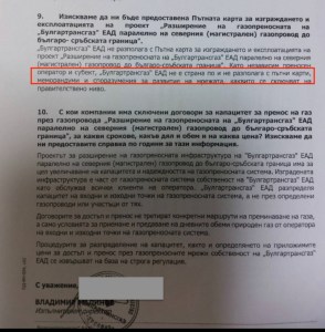 „Като независим преносен оператор и субект, „Булгатрансгаз“ ЕАД не е страна по и не разполага с пътни карти, меморандуми и споразумения за развитие на мрежата, каквито се сключват на правителствено ниво“, пише Малинов до БОЕЦ (вижте документа долу).