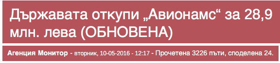Една интересна подробност може би хвърля светлина върху абсурдната ситуация. С Постановление за възлагане на ЧСИ Стоян Якимов, акциите на “Авионамс” са незаконосъобразно възложени на „Държавна консолидационна компания” АД, за сумата от 28 941 111 лева. Според текста на определението на СГС, постановлението за възлагане е от дата 13.05.2016 г. Още на 10.05.2016 г. обаче медиите гърмят със заглавия от рода на: “Държавата откупи Авионамс”.
