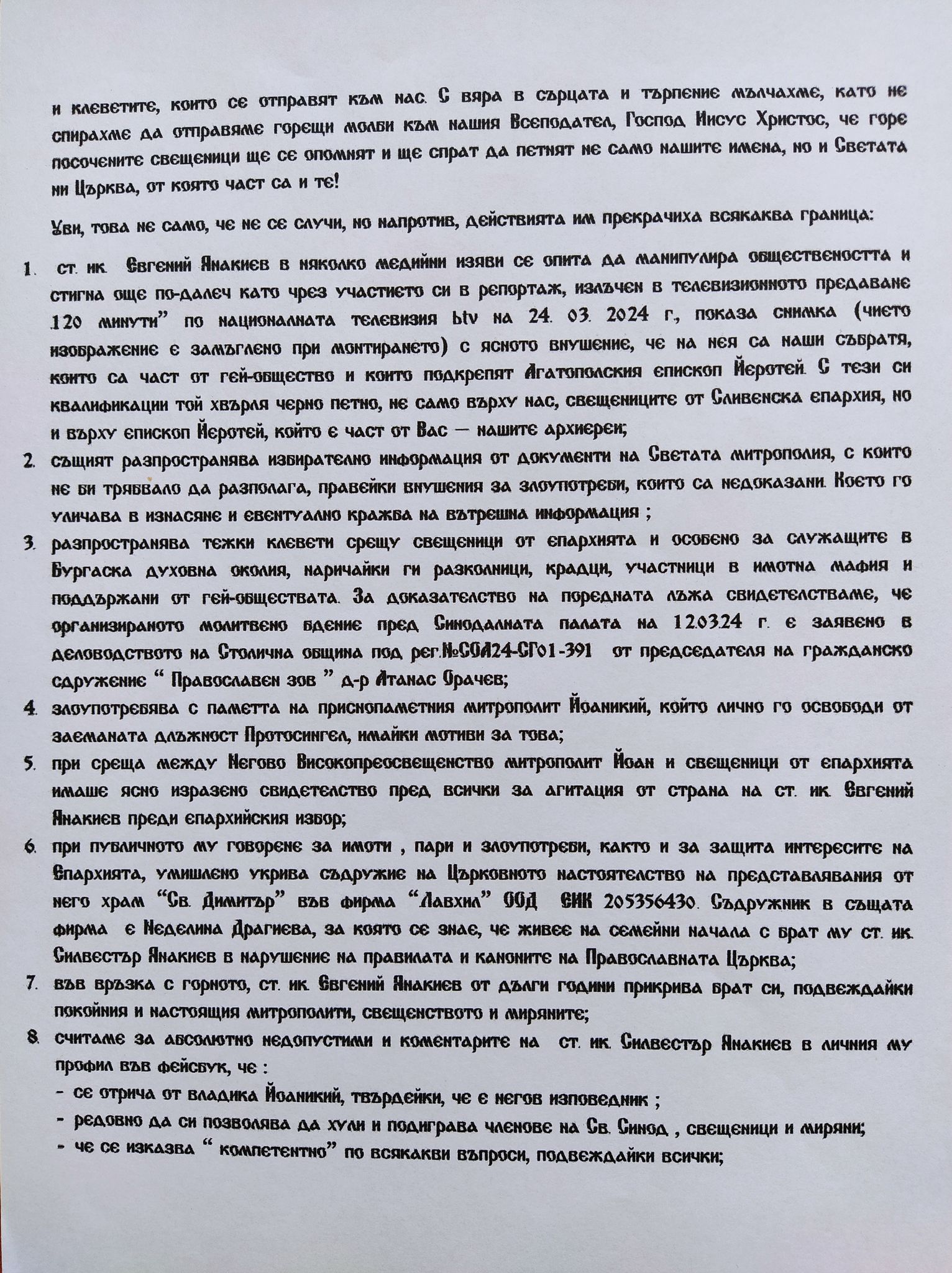 - ст. ик. Евгений Янакиев в няколко медийни изяви се опита да манипулира обществеността и стигна още по-далеч като чрез участието си в репортаж, излъчен в телевизионното предаване „120 минути“ по националната телевизия btv на 24. 03. 2024 г., показа снимка (чието изображение е замъглено при монтирането) с ясното внушение, че на нея са наши събратя, които са част от гей-общество и които подкрепят Агатополския епископ Йеротей. С тези си квалификации той хвърля черно петно, не само върху нас, свещениците от Сливенска епархия, но и върху епископ Иеротей, който е част от Вас – нашите архиереи;