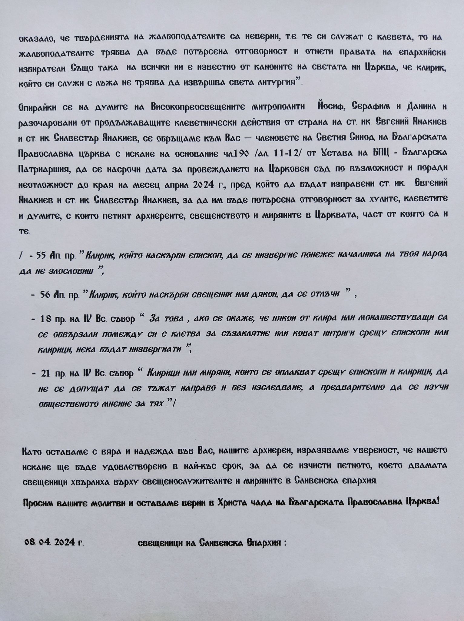 Опирайки се на думите на Високопреосвещените митрополити Йосиф, Серафим и Даниил и разочаровани от продължаващите клеветнически действия от страна на ст. ик. Евгений Янакиев и ст. ик. Силвестър Янакиев, се обръщаме към Вас – членовете на Светия синод на Българската Православна църква с искане на основание чл.190 /ал. 11-12/ от Устава на БПЦ – Българска Патриаршия, да се насрочи дата за провеждането на Църковен съд по възможност и поради неотложност до края на месец април 2024 г., пред който да бъдат изправени ст. ик. Евгений Янакиев и ст. ик. Силвестър Янакиев, за да им бъде потърсена отговорност за хулите, клеветите и думите, с които петнят архиереите, свещенството и миряните в Църквата, част от която са и те.