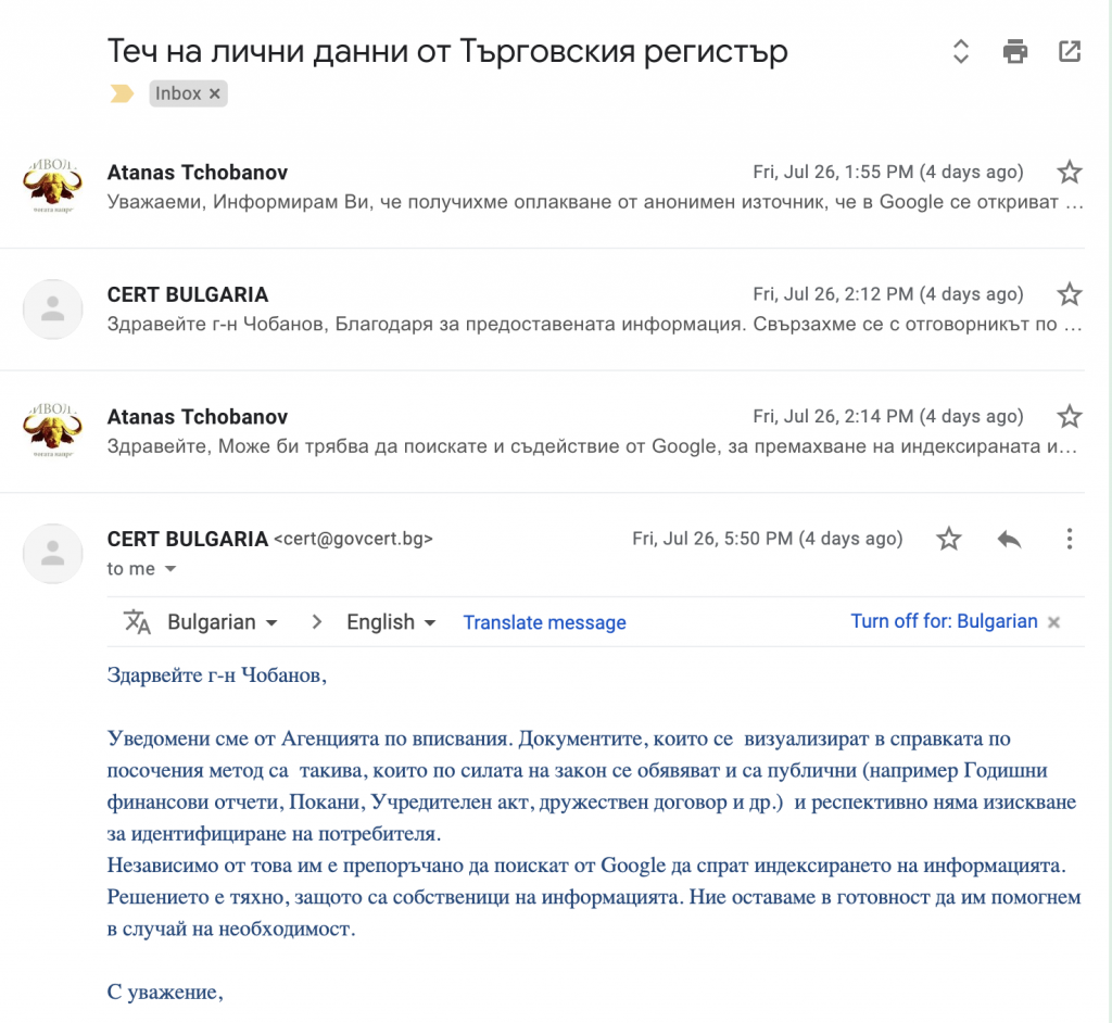 След като регистрираха инцидента без забавяне на 26 юли, от CERT са се свързали с Агенцията по вписванията и са им препоръчали да се обърнат към Google официално за прекратяване на индексацията на данните. Това явно е станало в началото на седмицата и в момента резултатите са прочистени, а търсенето за “лична карта” не връща нищо.