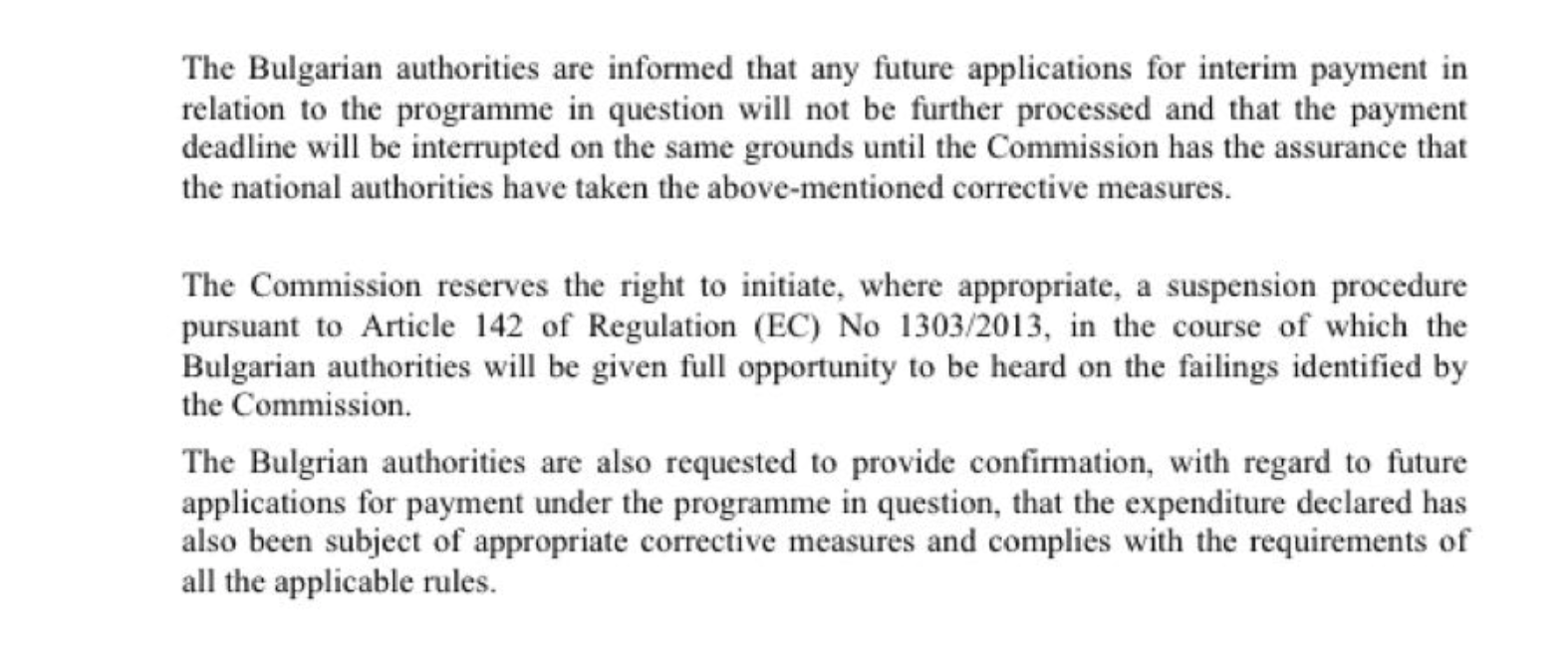 На българските власти са дадени предписания в 5 точки. Докато те не бъдат изпълнени, Комисията няма да одобрява междинни плащания, се казва в писмото. Комисията си запазва и правото да започне процедура за пълно спиране на програмата.