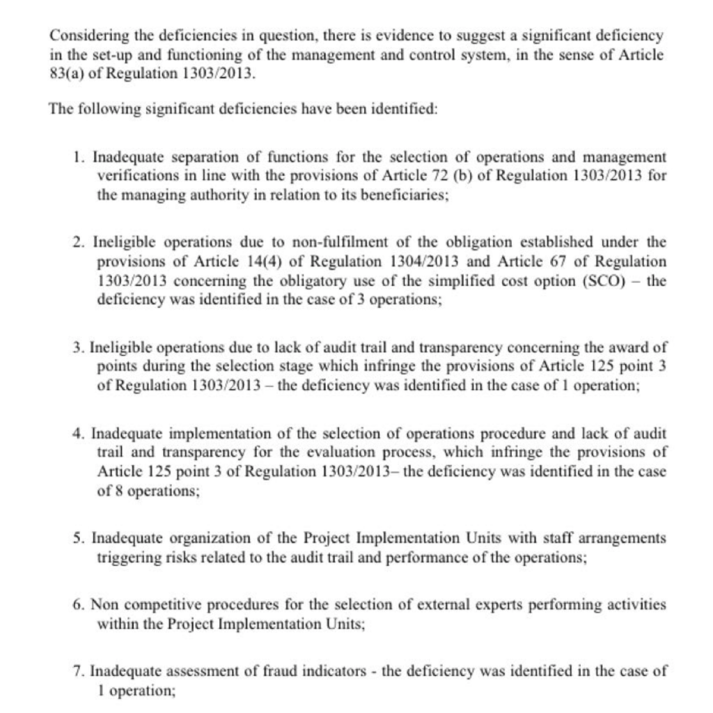 Неадекватно разделение на функциите между селекциониращите и проверяващите, липса на прозрачност и одитна следа в процесите на селекция и оценка на проектите, липса на конкуренция при избора на външни експерти и неадекватна оценка на индикаторите за възможни измами са сред нарушенията констатирани от Брюксел.