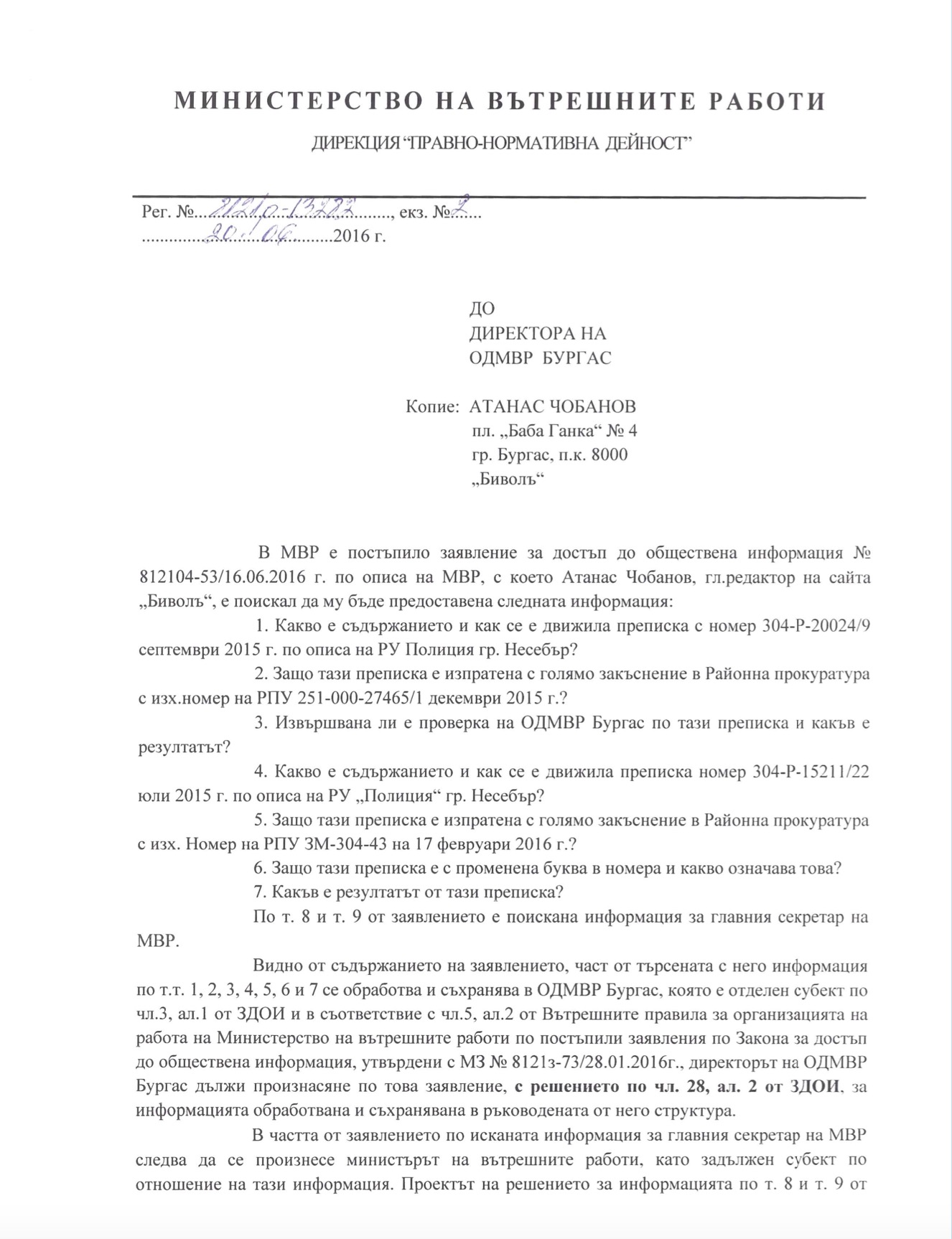 Областната дирекция на МВР в Бургас трябва да отговори на въпросите на Биволъ дали в патрулки и в сградата на РУ “Полиция” – Несебър са откривани тежки наркотици и какво се е случило със заведените преписки. Това става ясно от писмо на Дирекция “Правна” на МВР, получено в редакцията след запитване по реда на ЗДОИ.