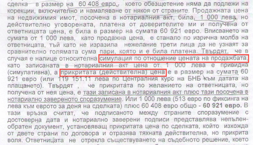 В съдебно решение на ОС-Кърджали е записано, че “действителната цена на сделката е в размер на сумата 60 921 евро (или 119 151,11 лв. по Централния курс на БНБ към датата на плащането)”.