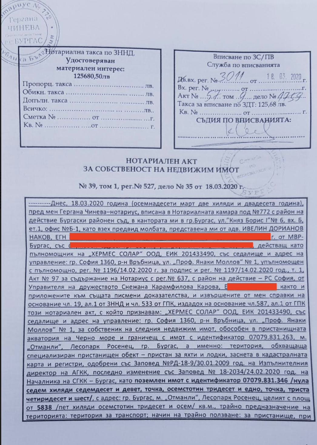 Посоченият нотариален акт е документ е с невярно съдържание, с който трябва да се занимава прокуратурата. Но преди да се стигне до узаконяването на собствеността с констативен акт, няколко институции са били запознати с намеренията на фирмата “Хермес Солар” да изгради пристанище, дали са положително становище, има издадена заповед на МРРБ вписване на имота в Кадастъра.
