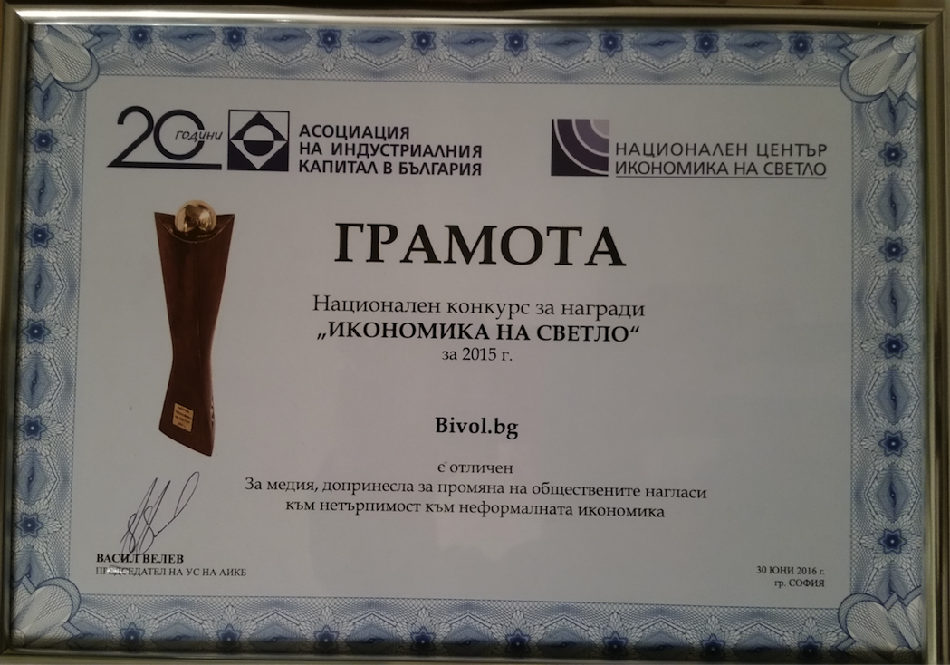 However, there are still people in Bulgaria who appreciate our efforts and deeds. Bivol was awarded by the Association of Industrial Capital in Bulgaria as a media that has contributed to changing public attitudes towards intolerance against the shadow economy.