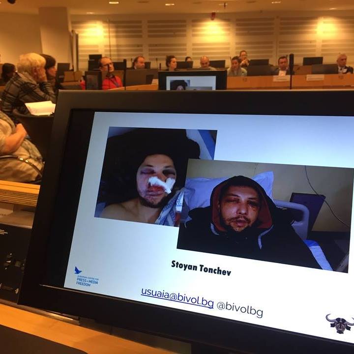 On Monday, February 19, around 12.30 pm, Stoyan Tonchev, reporter of Bivol, was brutally attacked by Hristo Shirokov, former bodyguard of notorious drug lord Dimitar “Mityo The Eyes” Zhelyazkov in front of the local police headquarters in the Black Sea town of Pomorie. The journalist became a target of physical assault, obscenities and threats. Shirokov is known in the underground by his nickname “Shirokata” (The Broad), and is currently a municipal councilor in the local parliament of Pomorie from the party largely representing the Bulgarian Muslim minority – Movement for Rights and Freedoms (DPS) He is known to be very close to Mayor Ivan Alexiev, from the ruling Citizens for European Development of Bulgaria party, GERB. Stoyan Tonchev was brutally beaten two years ago near his home and miraculously survived after a series of surgeries. The masterminds of the attack are believed to be precisely Alexiev and Shirokov. The two are frequently investigated by the journalist for corruption, abuse of power and of public resources.