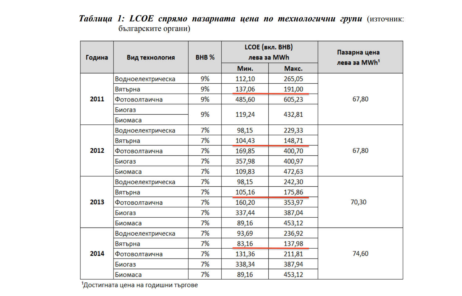 For the different types of equipment within each technology group, the Bulgarian authorities have set specific preferential purchase prices (e.g. different prices for small wind farms and large wind farms). For all types of Renewable Energy Sources, the calculated levelized costs of electricity (LCOEs) are equal to the preferential purchase price. LCOE also exceeds the average market price.