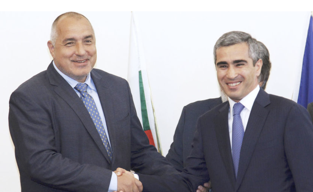Bulgarian Prime Minister Boyko Borisov offers a friendly handshake to Azerbaijani Deputy Prime Minister Elchin Efendiev after receiving an EUR 1.2 million donation.