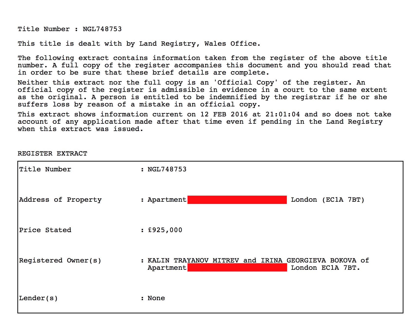Bokova and Mitrev’s property acquisitions
