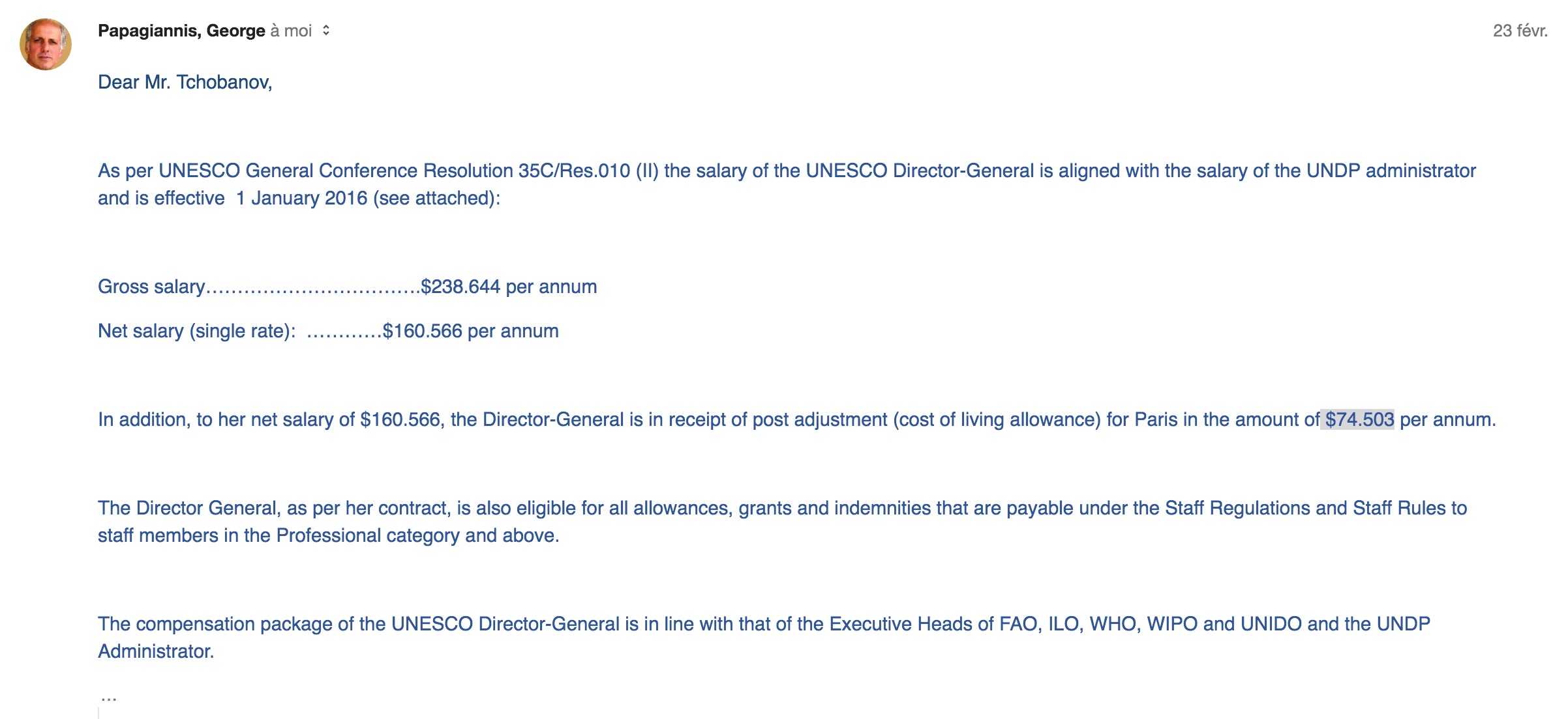 These figures are cited by UNESCO spokesman George Papagiannis in response to the first request for information by Bivol. Since the answer mentions other bonuses for which no information was given, we asked for details, but received them as a lump sum for all 20 key employees of UNESCO. We deducted from this lump sum the already mentioned “stay in Paris” adjustment, divided it by 20 and got the following: