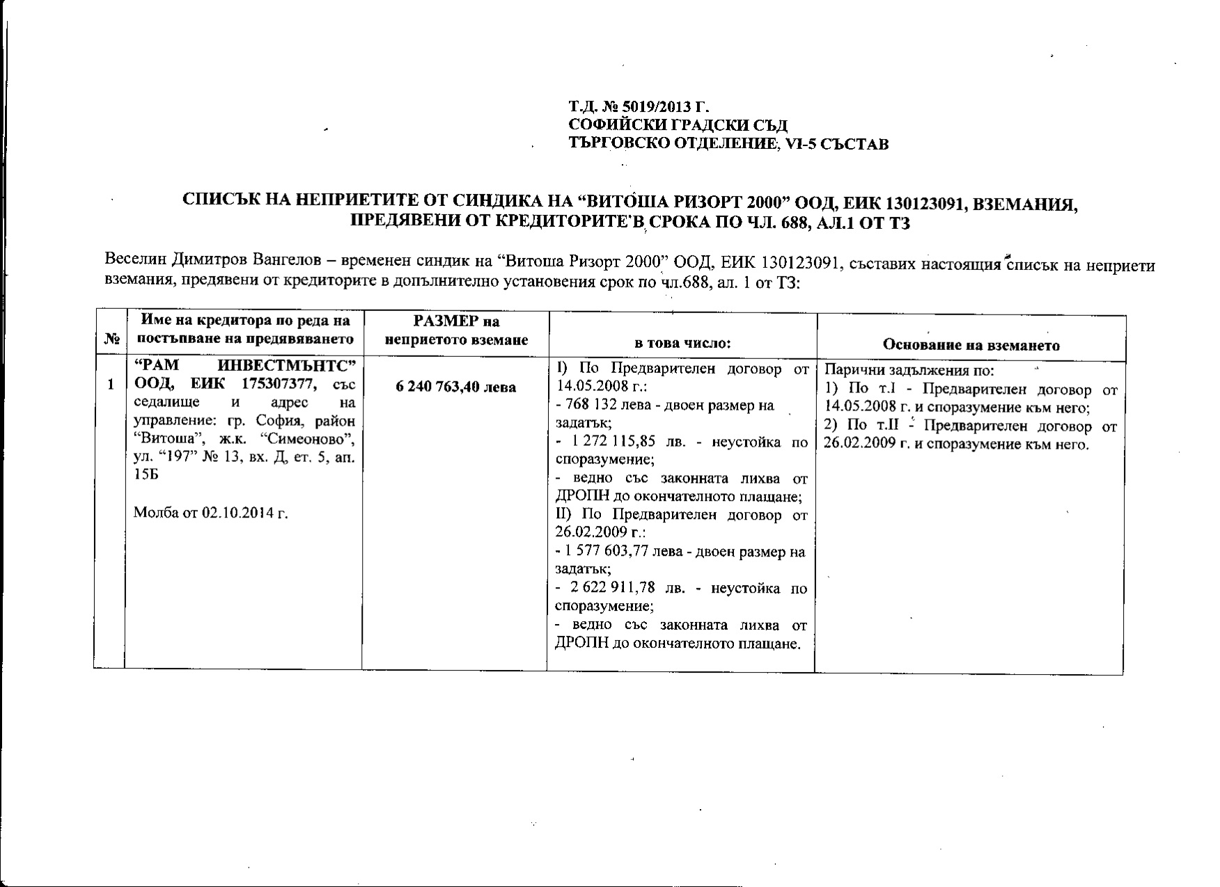 Subsequently, judge Bodikyan has withdrawn herself from the case and has been replaced by judge Nelly Aleksieva. She has also endorsed the trustee’s lists of creditors in the bankruptcy case. Trustee Vangelov was removed at the beginning of 2015, after the investors protested in writing before the Ministry of Justice, but his actions and the ones of the judge remained irrevocable. The Sofia Administrative Court (SAS) has confirmed the decision on “Vitosha Mountain Resort’s” overindebtness, even though the company remains indebted only to “Ultrastroy” and has been paying regularly and in full, prior to the last stage, without any indications of inability to pay the last installment as well.
