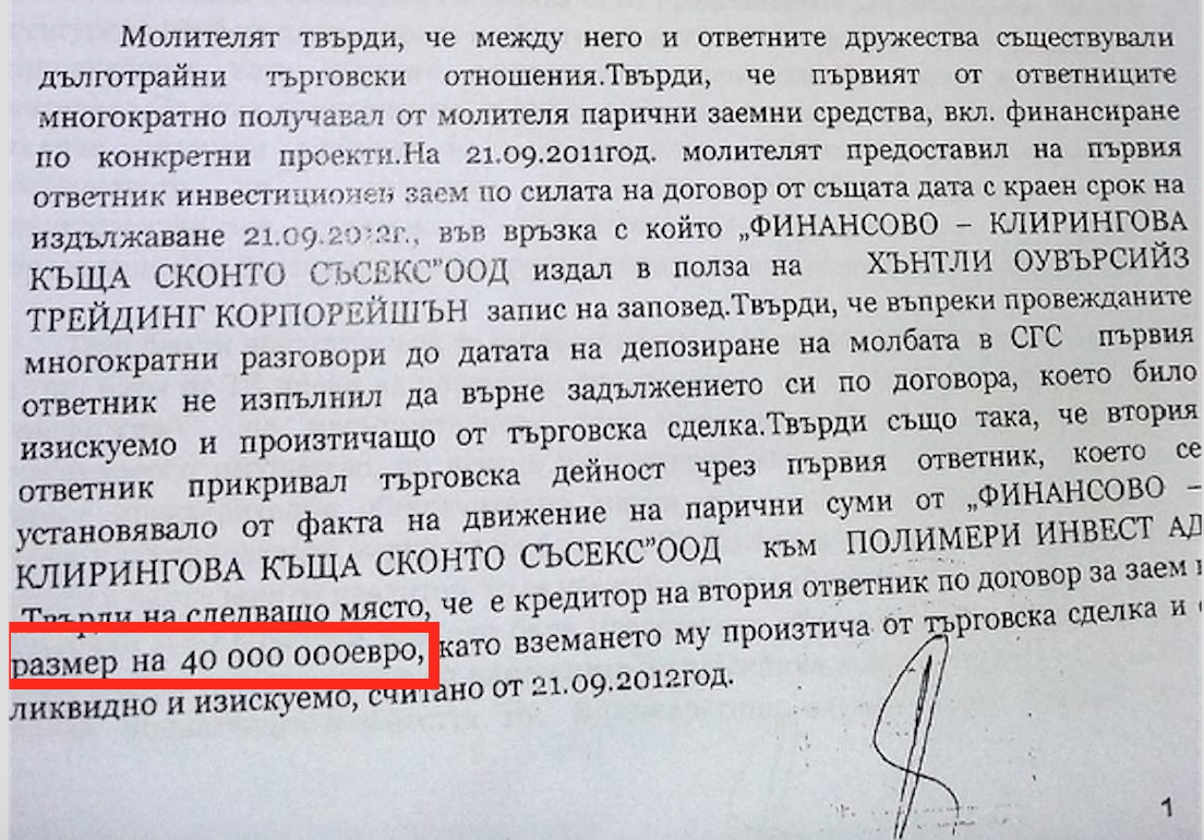 By ruling 1450 from March 11, 2014, Chenalova agrees that there was evidence of credit of 40 million euro granted by Huntley to Polimeri (Polymer) Invest for which Financial Clearing House Skonto Sussex had issued a promissory note. She imposed a lien on Polimeri Invest and appointed as temporary trustee Hristo Hristov.