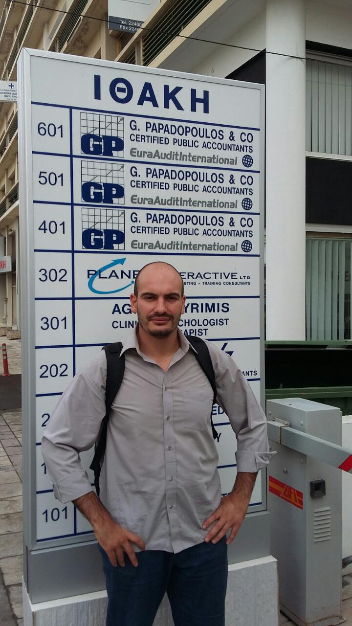 Bivol’s reporter Dimitar Stoyanov in front of the office of lawyer Papadapoolos where all of Georgiou offshores are registered