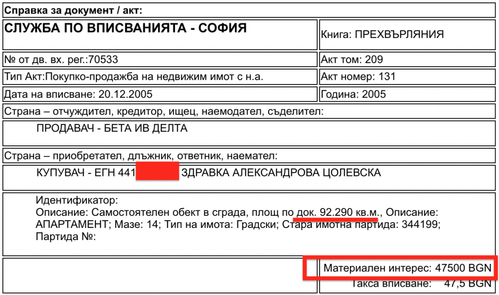 In 2005, the mother-in-law of architect Nestorov, Zdravka Tsolevska, secured another gainful property acquisition. She bought an apartment of 92 square meters in the capital Sofia for only BGN 47,500. The seller was the construction company “Beta Iv Delta”.
