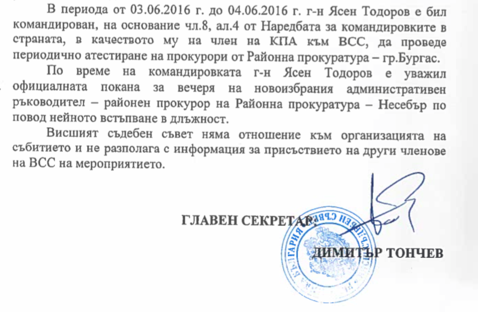 “On June 3 and 4, 2016, Mr. Yasen Todorov has been sent on a professional trip to conduct a periodic appraisal of prosecutors from the District Prosecutor’s Office in the city if Burgas. At the time of this trip, Mr. Yasen Todorov honored a dinner invitation from the newly-elected District Prosecutor of Nessebar, on the occasion of her appointment. The Supreme Judicial Council has no relation to the organization of the event…”