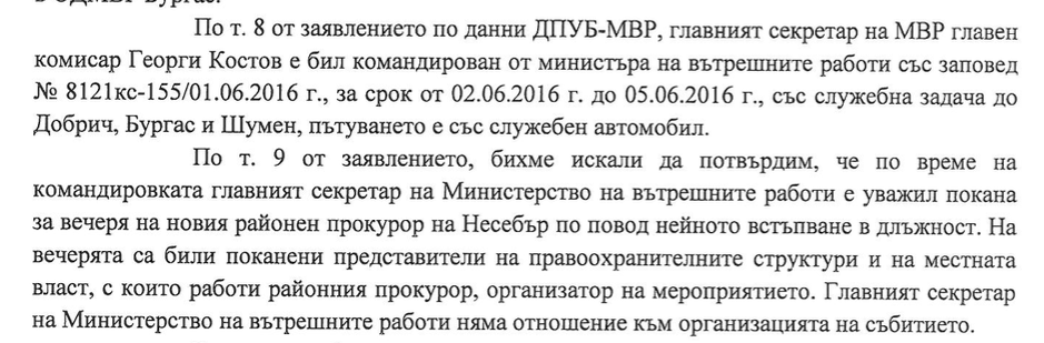 “…The Chief Secretary of the Interior, Chief Commissar, Georgi Kostov, was sent with an order of the Minister of the Interior on a professional trip with a professional task to the cities of Dobrich, Burgas, and Shumen; he travelled in an official vehicle. We would like to confirm that at the time of this trip, the Chief Secretary of the Interior honored a dinner invitation from the new District Prosecutor of Nessebar, on the occasion of her appointment. Representatives of law enforcement and local authorities, working with the District Prosecutor, organizer of the event, were invited to this dinner. The Interior Ministry’s Chief Secretary has no relation to the organization of the event.”