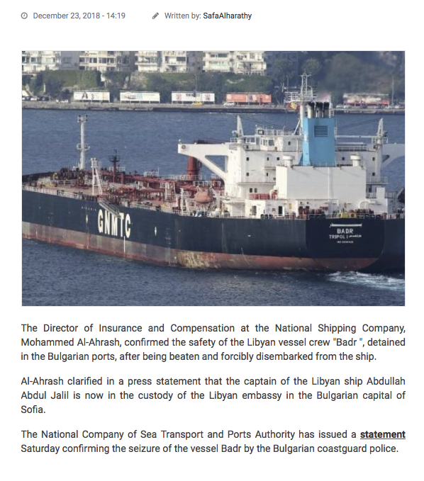 Armed men (some purporting to be Bulgarian border police) boarded MT BADR – a vessel within the fleet of the General National Maritime Transport Company of Libya. The vessel’s captain and crew were then forced to immediately disembark the ship. No legal documentation, court order or warrant was provided to justify or support this action – the crew were simply ordered from the ship at gunpoint, under threat of violence. The vessel’s communications/ AIS were then immediately cut, meaning that neither the vessel’s owners nor any legitimate authority can now contact or track the whereabouts of the ship.