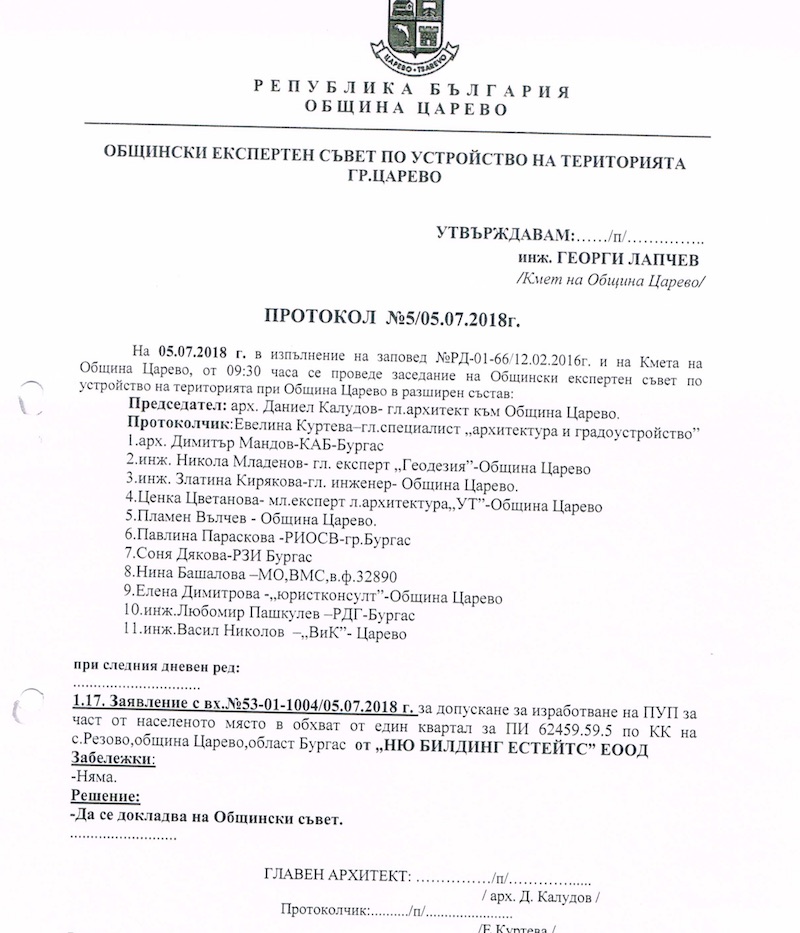Bivol first reported the illegal decision, analyzing why it is inconsistent with current legislation. Eventually, this analysis was confirmed by the Regional Inspectorate of Environment and Waters (RIEWs) in the coastal city of Burgas and the case was taken by the Regional Prosecutor’s Office, which ordered the Regional Governor of Burgas, Valcho Cholakov, to return the illegal decision back to the Tsarevo Municipal Council.