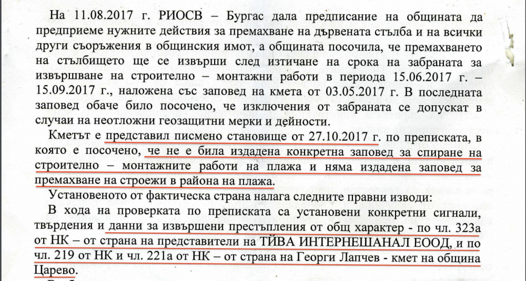 In the course of the examination of the file, specific signals, statements and data about committed crimes of general character – under Art. 323a of the Penal Code (PC) – have been established and they have been committed by representatives of TIYVA INTERNATIONAL LTD and under Art. 219 of the PC and Art. 221 of the PC – by Georgi Lapchev, Mayor of the Municipality of Tsarevo.