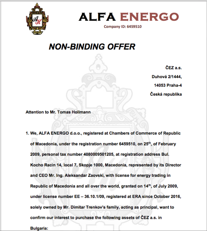 A Macedonian company, Alfa Energo, has sent a non-binding offer to the Czech State-owned electric power utility CEZ Group for its business in Bulgaria. It happened in early 2017, but the offer had not turned into a binding commitment, according to a document that Bivol possesses.