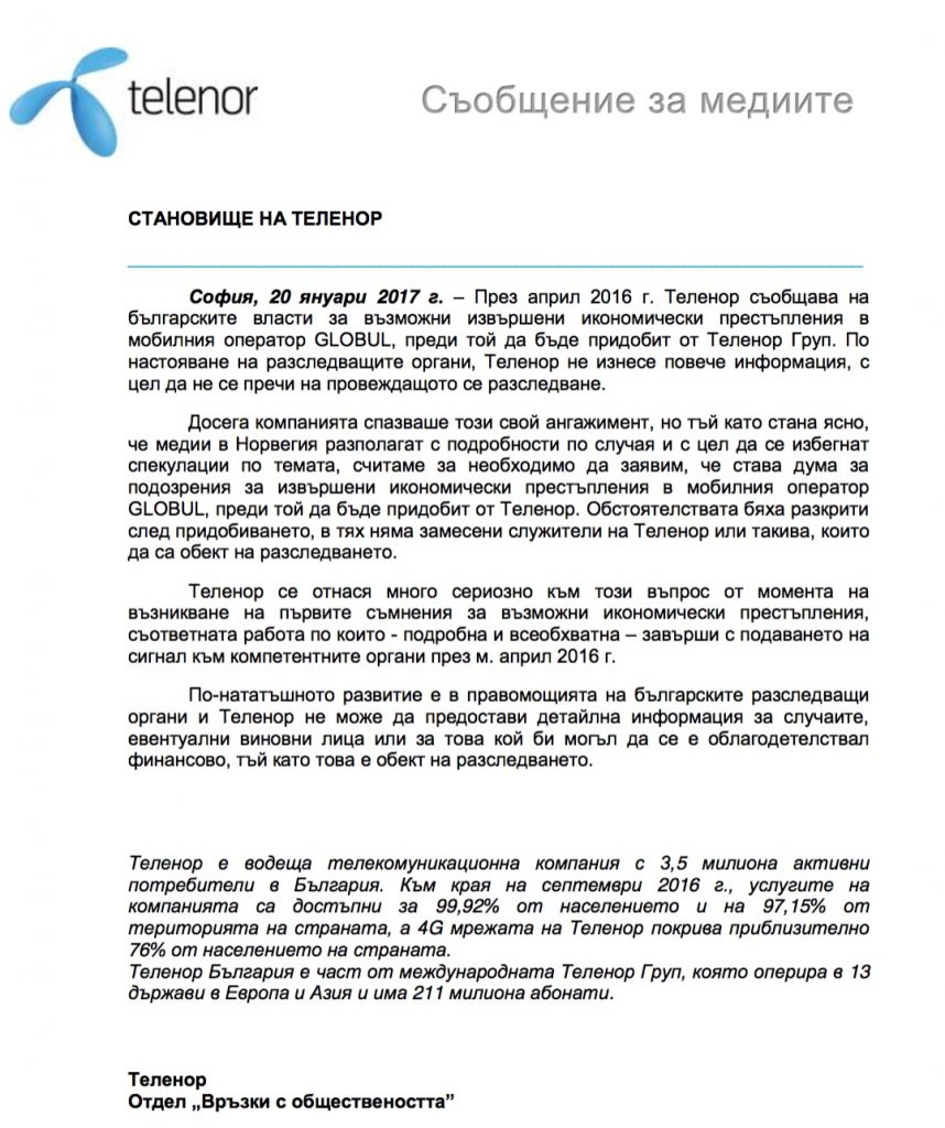 The response of the Bulgarian subsidiary of Telenor provides information that the company has conducted an internal investigation that has been “detailed and comprehensive” before notifying the Bulgarian authorities.