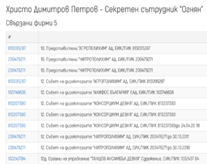 At least two communist regime state security agents have been found among the company’s former board members: Christo Dimitrov Petrov (a partner in 5 companies), who was known as secret collaborator Ognyan, and Martin Georgiev Martinov (partner in 3 companies), a.k.a. agent Mihaylov.