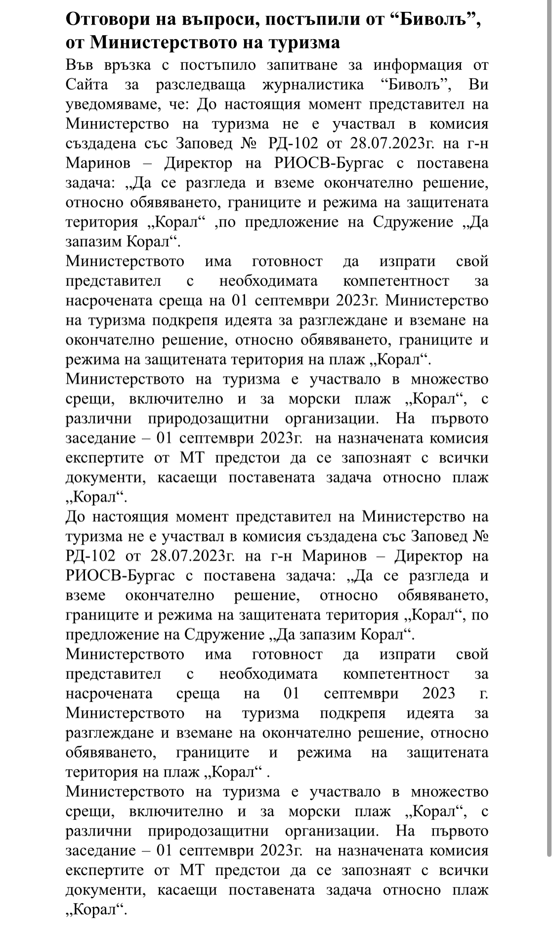 Както и предположи “Биволъ” през август 2023 г., специалната „комисия“, която трябваше да вземе решение за обявяването на нова защитена територия зад плажа Корал, се оказа напълно нелегитимна, а проведеното на 1 септември заседание се превърна в пълен фарс, граничещ с цинизъм. За това алармираха от природозащитната организация Сдружение “Да запазим Корал” по повод продължаващия и при кабинета “Денков – Габриел” скандал Дюнигейт. Няколко дни след нарочната комисия, община Царево беше ударена от бедствие. Отново една от основните причини за бедствието беше бетонирането на морския бряг. Природата отвърна на удара, а кметът на ГЕРБ Георги Лапчев и неговите сподвижници изглежда не разбраха, че природата е по-силна от тях във войната им срещу нея.