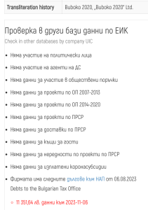 Същевременно справката на “Биволъ” показва, че “Бубоко 2020” очевидно не си плаща изрядно и данъците, което се смята за нарушение. По данни към 6 ноември 2023 г. непогасените задължения на фирмата на Иван Нейков към Национална агенция за приходите (НАП) са на стойност над 11 000 лв. (вижте справката долу).