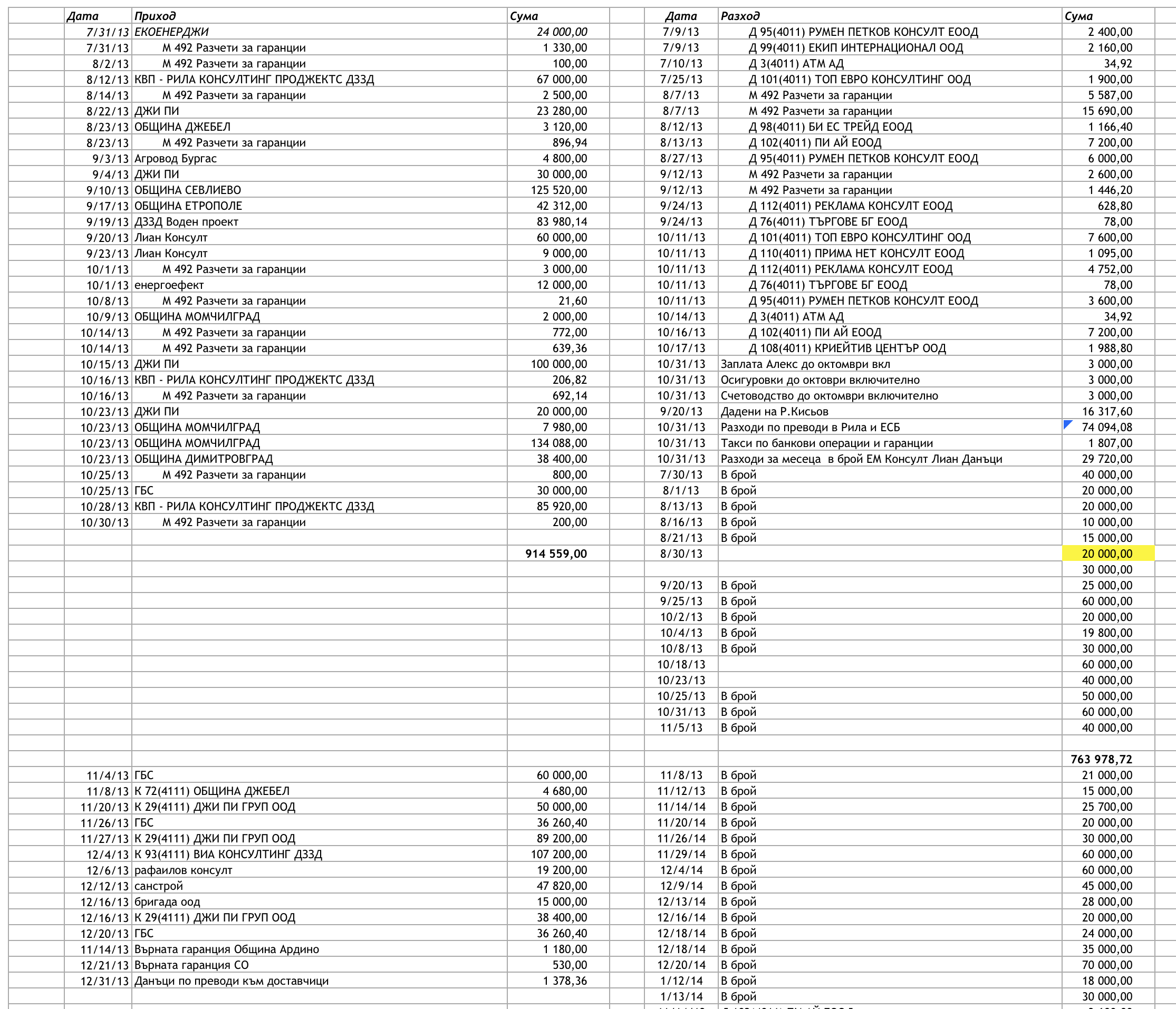 От друг файл с обобщение за приходите и разходите на една от фирмите става ясно, че от юли 2013 до юни 2014 над 2 милиона лева плащания са извадени в брой (виж Book1T (14)