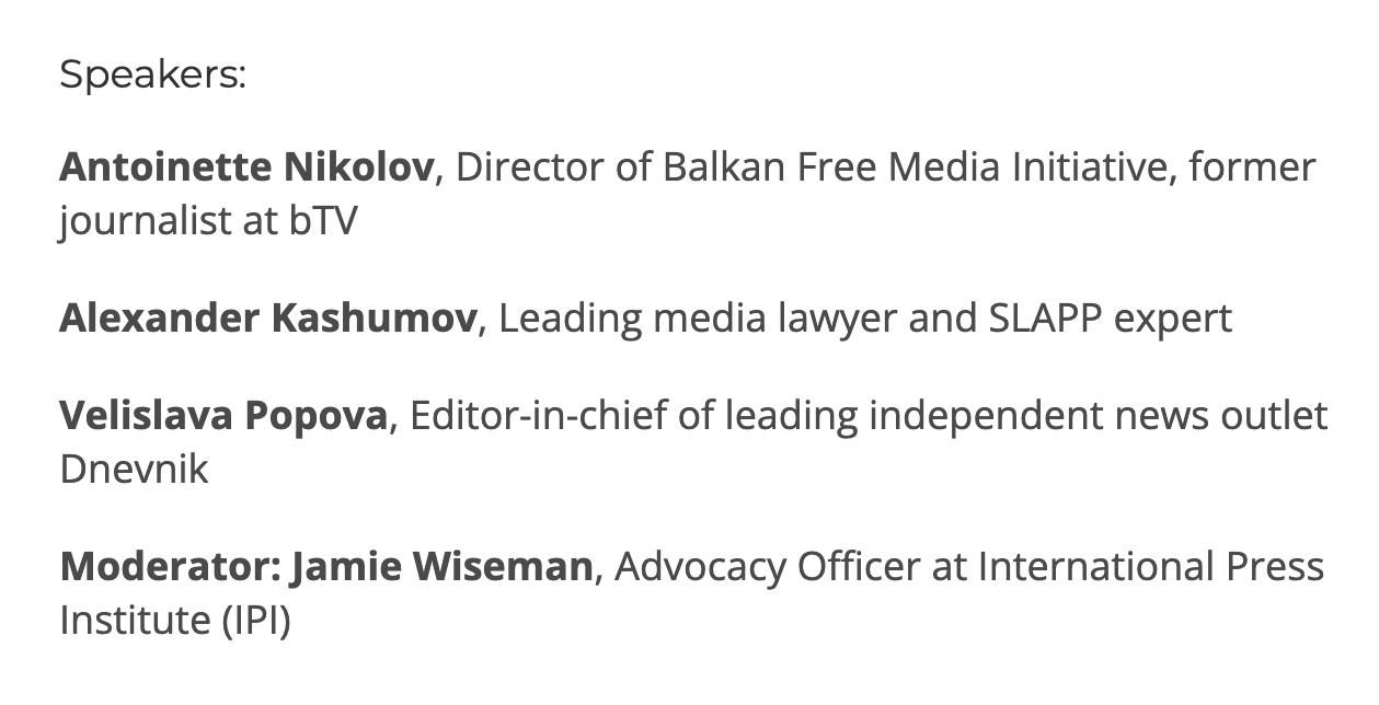 Модераторът на дискусията Джейми Уайсман от IPI призна, че се надява новото българско правителство да работи за подобряване на медийната среда в България. Според него от чутото от него от журналистите по време на уебинара следва, че “има още много работа да се свърши в България”, и по повод SLAPP-овете и по повод подобряването на медийната среда като цяло.